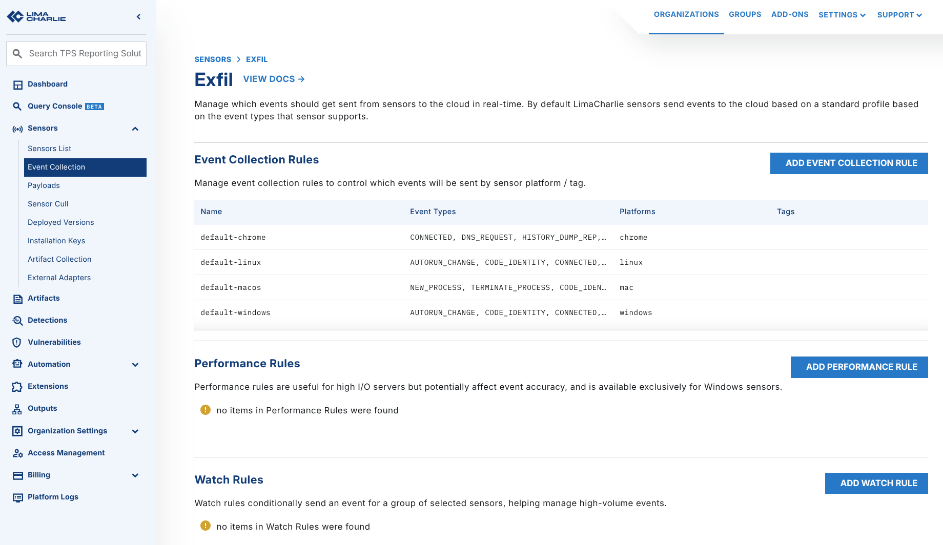 - Allow up to 10 minutes for data to come into LimaCharlie after setting up a new Artifact Collection rule. Data will flow in real-time after that point.