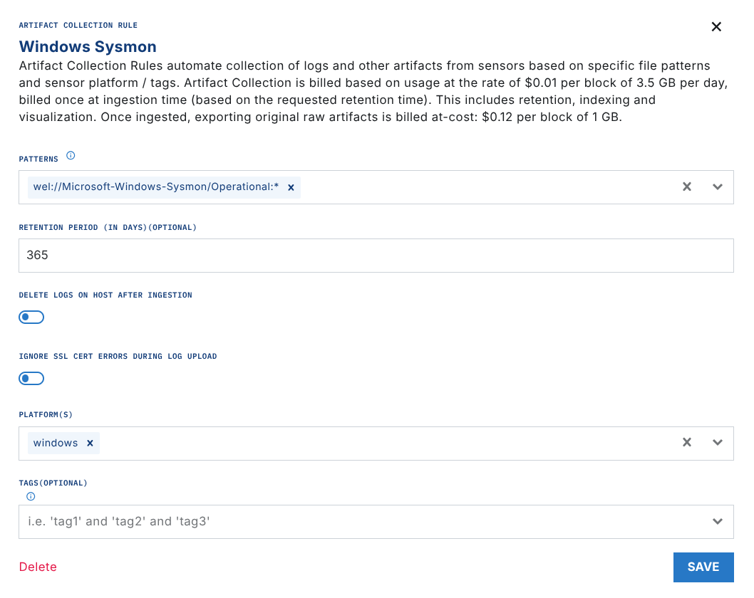 Artifact Collectionsection and add a new collection rule with the following path to bring in all Sysmon events: