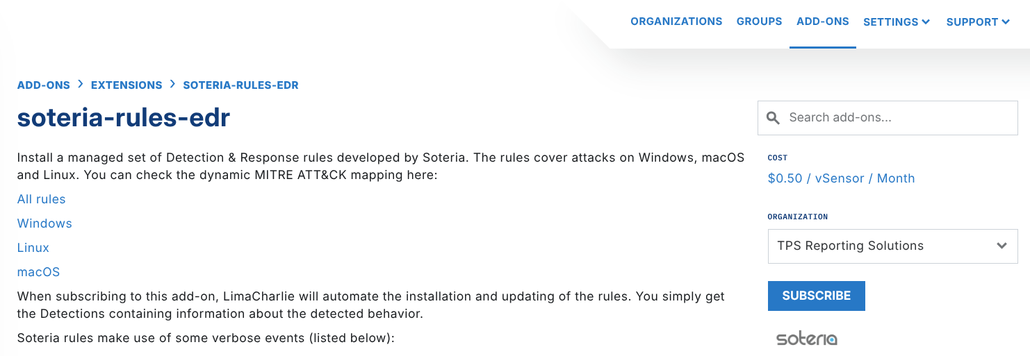 Please note that Soteria won't get access to your data, and you won't be able to see or edit their rules - LimaCharlie acts as a broker between the two parties.