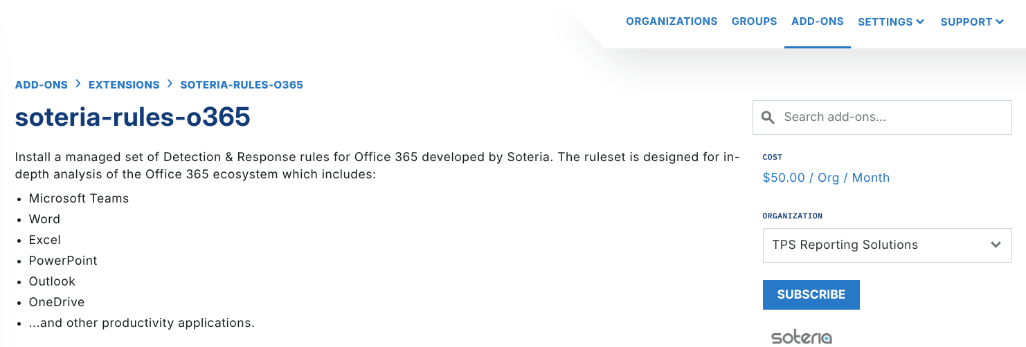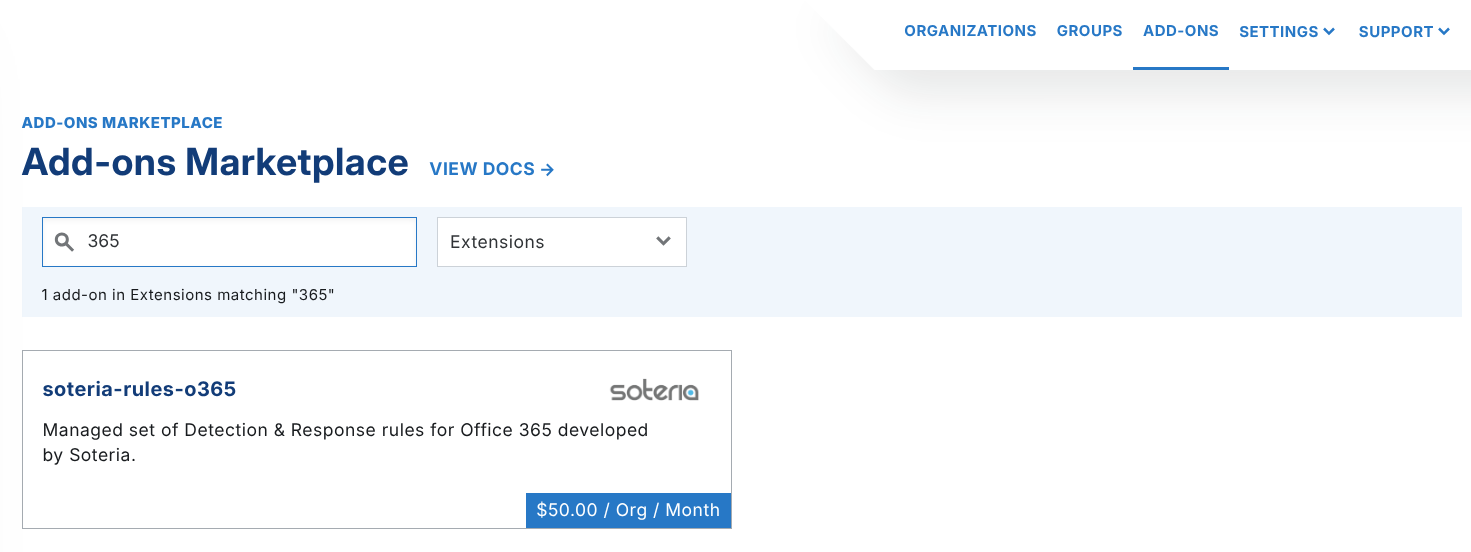 To enable Soteria's O365 ruleset, navigate to the Extensions section of the Add-On Marketplace and search for Soteria. You can also directly select soteria-rules-o365.