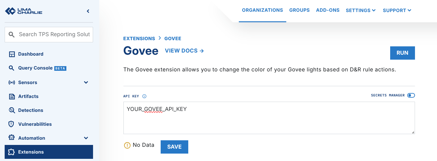 255,0,0), and revert back to white (255,255,255) when the alertdurationhas ended. - Add your Govee API key to the extension configuration: