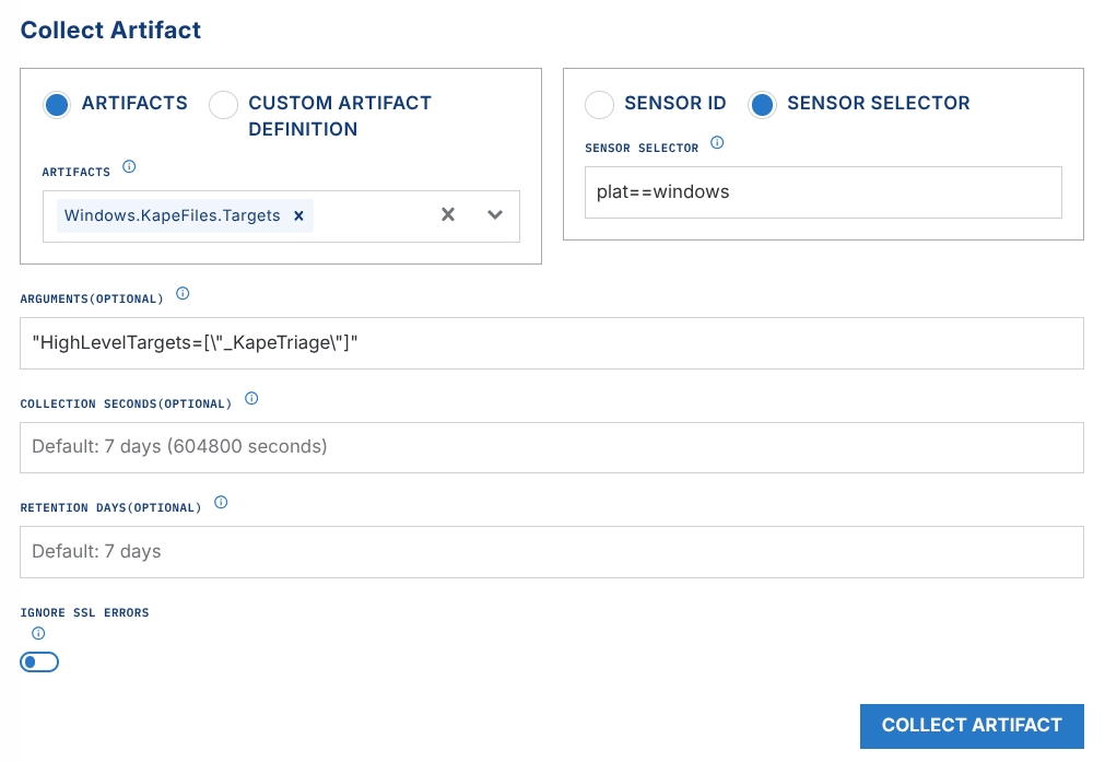 - Retention Days (optional) - Define how long the collected artifact will be retained by the platform.