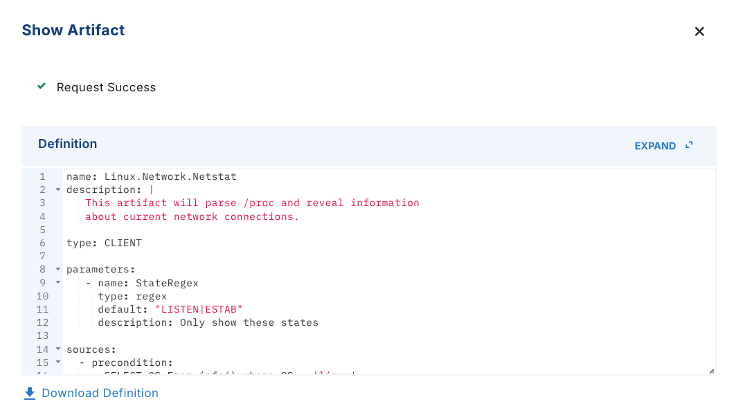 - Show Artifact - allows you to inspect the VQL artifacts available for collection