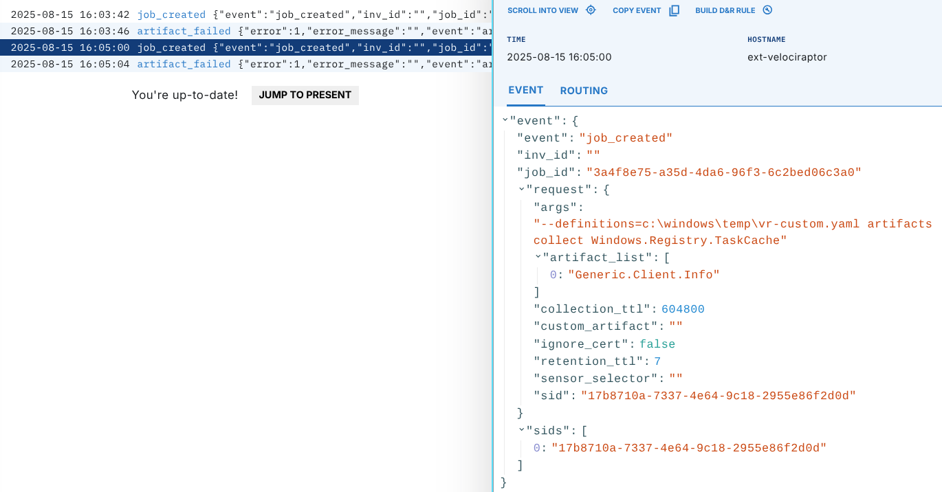 Let's say you wanted to automatically fetch new Velociraptor collections and send somewhere else for storage/processing. This can be accomplished via rules which watch for the artifact upload and send to a tailored output.