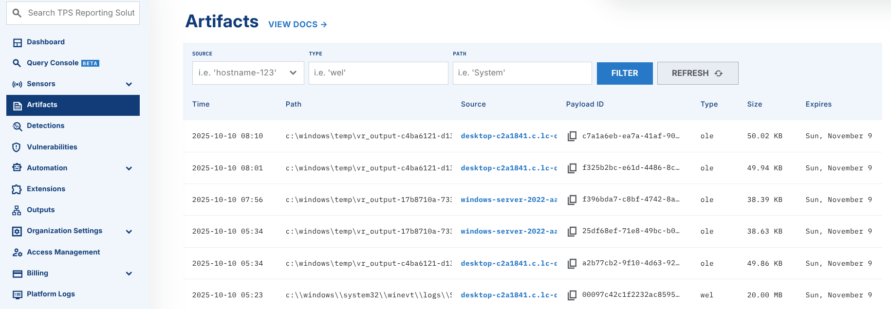 Velociraptor will generate a ZIP file with all collected data, which is automatically ingested into LimaCharlie's Artifact system for download.