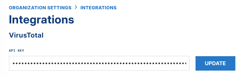 Once you have your VirusTotal API key, you can add it in the Organization integrations section of the LimaCharlie web app.