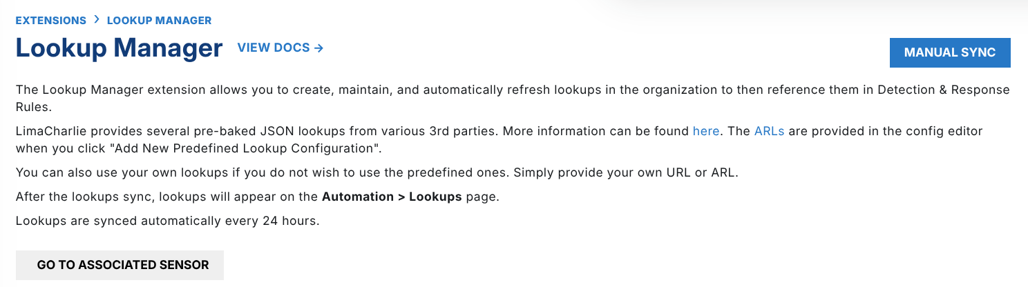 Generally the top of the extension page will show the extension label and it's short description. If it exists, it will also show a button for quick access to this extension's "associated sensor".