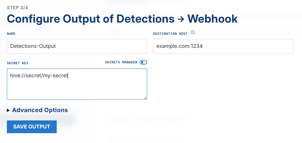 Next, create an output in the web app, using the value hive://secret/my-secret as the Secret Key value.